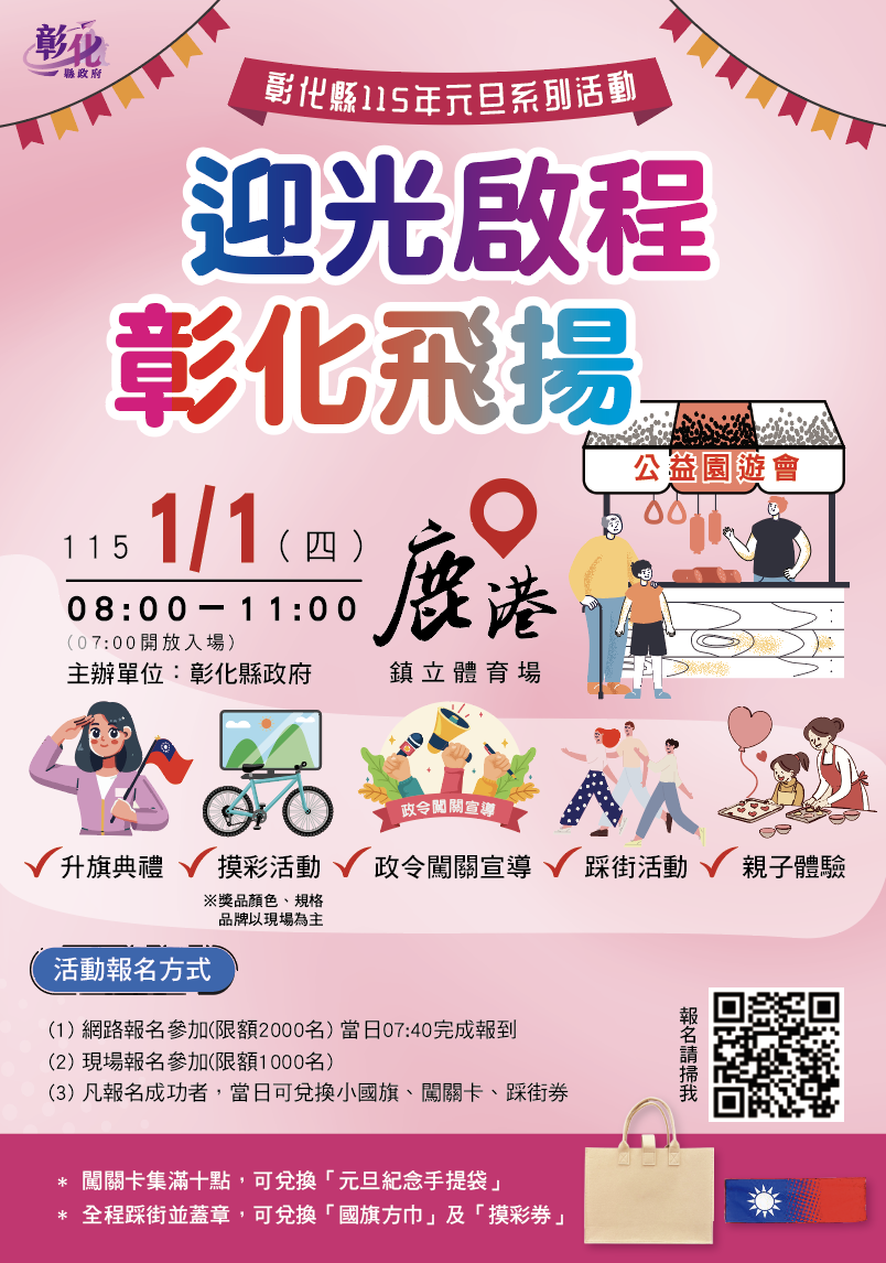 新聞焦點 「迎光啟程.彰化飛揚」 中華民國115年元旦升旗典禮暨公益園遊會及踩街活動 發布日期 2025/11/27~2025/12/27 | 發佈單位: 社會處 | 發佈日期: 鐘科長 7532211分機2211 | 更新日期 2025/11/27 | 瀏覽人數: 270人 為迎接中華民國115年元旦,彰化縣政府將於115年1月1日(星期四)上午8時至11時,在鹿港鎮立體育場舉辦「迎光啟程.彰化飛揚」元旦系列活動。彰化縣長惠美誠摯邀請縣民朋友在新年的第一天清晨,與家人、朋友一同參加元旦系列活動,到場歡慶元旦新年喜悅! 本次元旦活動精彩多樣,內容包括元旦升旗典禮、公益園遊會、政令闖關宣導、踩街活動、親子手作體驗及摸彩等。活動特別推出「闖關卡集點活動」,民眾只要於現場參與公益攤位互動或購買商品,集滿十點即可兌換「元旦紀念手提袋」1只。親子手作區則提供粉彩書籤、絹印紅包袋、造型氣球、手繪燈籠等多項體驗活動,讓大小朋友都能在元旦早晨共享歡樂時光。 升旗典禮結束後,全程參加鹿港老街道踩街巡遊,憑集點蓋章的踩街券,可兌換限量「國旗方巾」1個及「摸彩券」1張,當天摸彩活動有超過數80項以上的獎品,包含電視機、腳踏車等豐富好禮,為新年增添更多驚喜! 感謝鄉親們的熱情支持,本次活動自開放網路報名後非常踴躍,原規劃2,000個網路名額於2日內即全數額滿。為回應大家的期待,縣府將再加開1,000個網路名額,同時活動當日現場亦提供1,000個現場名額,讓更多鄉親參與。凡報名成功者,均可於元旦當日領取「小國旗」、「闖關卡」及「踩街券」,歡迎大家攜手「迎光啟程、彰化飛揚」,以充滿希望與能量迎接嶄新一年的到來! 更多活動資訊,請至彰化縣政府社會處網站查詢(路徑:彰化縣政府社會處→ 首頁→ 訊息中心→ 「迎光啟程.彰化飛揚」中華民國115年元旦升旗典禮暨公益園遊會及踩街活動) 網址https://social.chcg.gov.tw/03bulletin/bulletin04_con.aspx?bull_id=420952