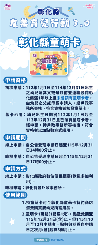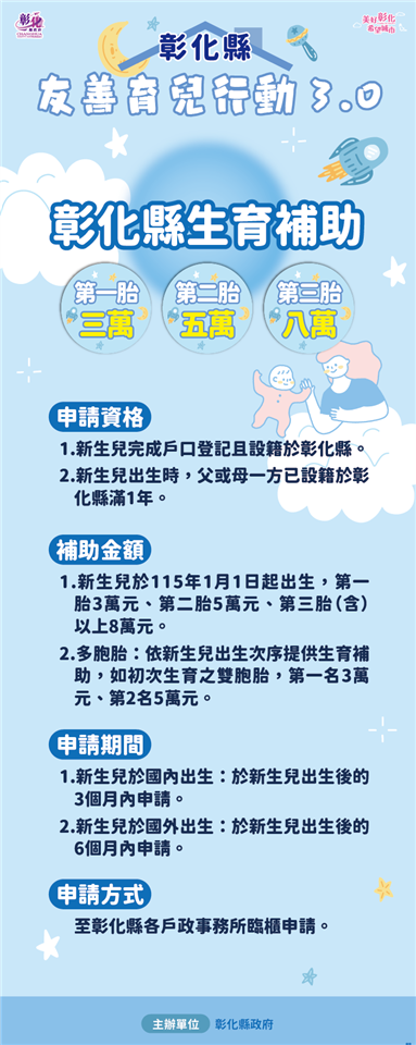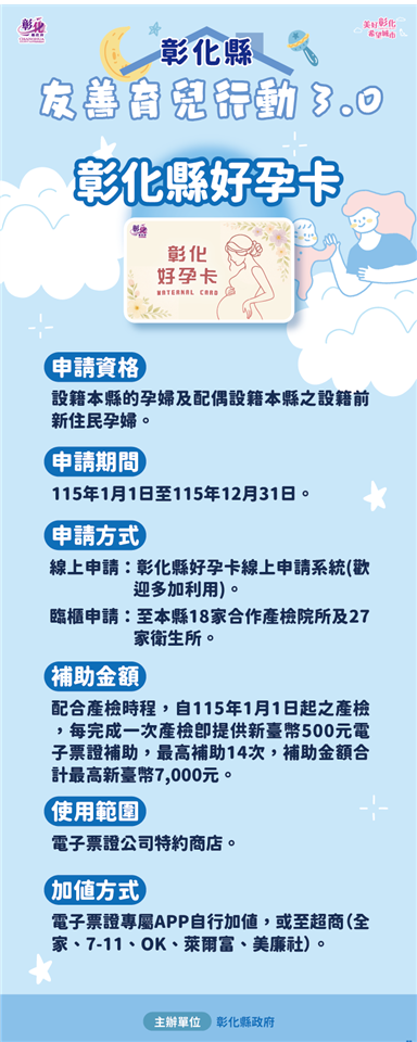新聞焦點 好孕卡、生育補助加碼、童萌卡三大措施 彰化縣政府推動「友善育兒行動3.0」 陪伴家庭迎接新生命 發布日期 2025/12/30~2026/01/30 | 發佈單位: 社會處 | 發佈日期: 社會處婦女及新住民福利科許代理科長 7532291 | 更新日期 2025/12/30 | 瀏覽人數: 106人 《置頂》 近年來全台生育率逐年下降,彰化縣亦無法置身事外,為應對日趨嚴重的少子化問題,彰化縣政府於今(30)日在縣府中庭舉辦「友善育兒行動3.0」啟動記者會,彰化縣長王惠美與會。王縣長宣布於明(115)年起推動好孕卡、生育補助加碼、童萌卡等3大措施,涵蓋懷孕、生產到育兒等重要階段,提供更完整及貼近需求的支持,陪伴縣民朋友迎接新生命、安心成家。 王縣長表示,感謝議長謝典霖及所有議員對預算的支持,面對少子化這項國安問題,縣府特別整合社會處、民政處及衛生局的各項資源,針對懷孕、生產到育兒等3大階段,提供最貼心的陪伴,協助大家安心成家、放心生育、開心育兒。首先是「好孕」政策,明(115)年正式推出「好孕卡」,設籍本縣的孕婦,以及配偶設籍本縣之設籍前新住民孕婦,提供14次公費產檢服務,每次產檢可獲得500元的電子票證(悠遊卡)補助,最高補助7,000元,可用於產檢交通接駁、加油充電或於藥妝店及醫療院所購物使用,期望透過實質支持,減輕準媽咪的負擔,鼓勵落實定期產檢,全面守護母嬰健康。 王縣長指出,為進一步減輕家庭的經濟壓力,針對生產與育兒政策採取「生越多、補助越多」的方案,從明年起,生育補助由原本每胎3萬元,調整為第一胎3萬元、第二胎5萬、第三胎(含)以上8萬元,民眾於戶政事務所辦理登記時即可一併申請,盼讓年輕家庭願生、敢生。此外,今年已實施且廣受好評的「童萌卡」也將於明年持續辦理,針對1歲至3歲的幼兒發放,可用於購買嬰幼兒必需品,未來更計畫納入早期療育院所(機構)使用,讓育兒政策更臻完善。 同時也提醒親愛的家長們,114年9月30日以前(含)童萌卡申請案件之點數使用效期至114年12月31日(含)止。但114年10月至12月申請者,點數效期為自申請日之次月(含)起算3個月止,逾期童萌卡點數自動歸零,請留意使用時間,以免影響權益。 縣議員白玉如代表致詞表示,感謝王縣長縣府團隊用心規劃,考慮各年齡層縣民的需求,除生育補助生三胎最高補助8萬元外,去年針對幼童推出童萌卡,現在又推出好孕卡,所有議員也都大力支持縣府政策,期望提供更友善的生育環境鼓勵年輕人成家。 悠遊卡董事長林志盈表示,彰化縣全國首創的童萌卡發行至今已突破2萬張,點數領用率高達9成,這項政策由縣府投入2億元預算補助家長,將龐大商機留給在地店家。此外,明年的「好孕卡」更全國首創將補助與產檢結合,孕婦在產檢時透過與診所連線的「超級悠遊卡」,即可直接獲得每次500元的補助金。感謝王縣長對母嬰政策的用心,提出貼心構想,將每個細節做好。 與會貴賓有立委謝衣鳯、縣議員白玉如、黃柏瑜、蕭文雄、縣議員陳玉姬服務團隊、埔心鄉公所主任秘書張滿祝、悠遊卡股份有限公司董事長林志盈、彰化縣醫師公會召集委員林峯文、皓生醫院長蔡宗冀、彰化基督教醫院婦產部主治醫生楊珮音、縣府民政處長劉玉平、社會處副處長涂敏群、彰化縣衛生局副局長蕭惠玲、各級民意代表與地方仕紳等。