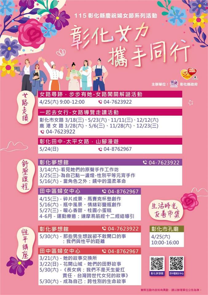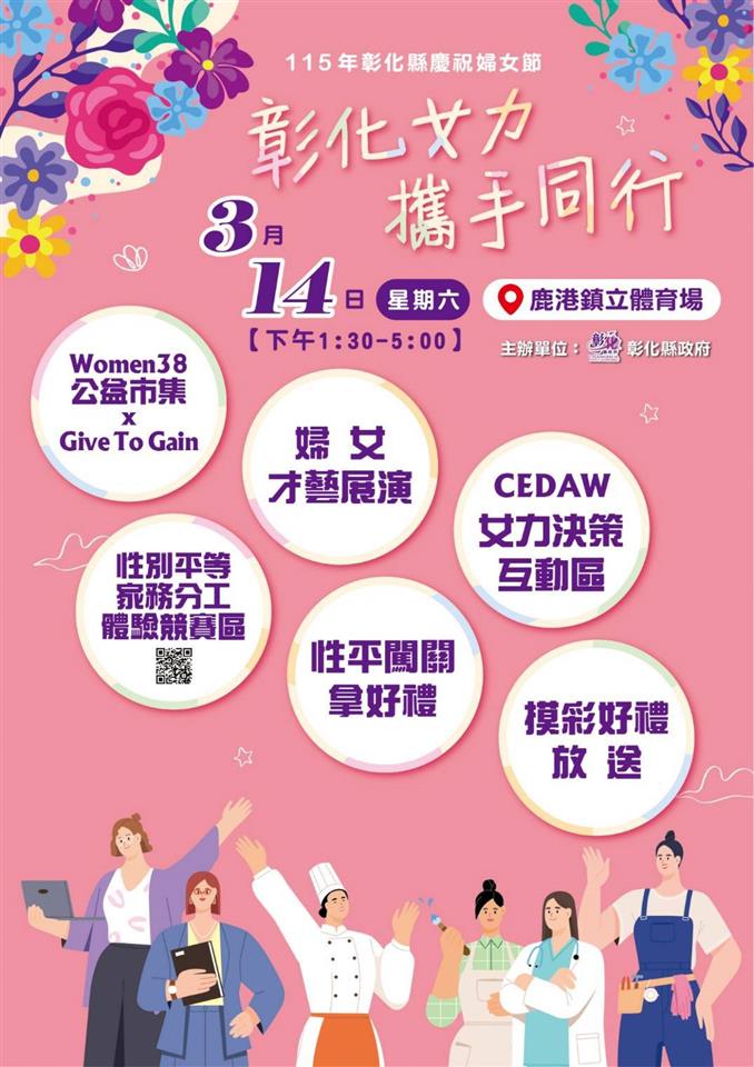 新聞焦點 「彰化女力 攜手同行」 慶祝彰化縣婦女節系列活動盛大啟動 發布日期 2026/03/10~2026/04/10 | 發佈單位: 社會處 | 發佈日期: 婦女及新住民福利科 許代理科長 7532291 | 更新日期 2026/03/10 | 瀏覽人數: 19人 為響應國際婦女節,彰化縣政府於今(10)日在縣府6樓咖啡藝廊舉辦「115年彰化縣慶祝婦女節系列活動-彰化女力 攜手同行」啟動記者會,宣示連結縣府各局處及婦女社福團體,共同推展多元創新的婦女福利服務,持續提升婦女權益並促進社會參與,全面展現彰化女性的自信與能量。 社會處長王蘭心表示,3月是浪漫、溫暖又充滿希望的月份,縣府連結各局處,一起向偉大的婦女致敬。今年規劃許多活動,3月14日下午在鹿港鎮立體育場辦理慶祝115年婦女節活動,內容有千人共舞、Women38公益市集、婦女權益政令宣導區、CEDAW女力決策互動區、Give To Gain打卡牆、性別平等家務分工體驗競賽、闖關及性別找一找等活動。其中Women38公益市集每年透過義賣募集1百萬協助社福團體,今年Women38公益市集邁入第6年,將達到6年6百萬總額。歡迎民眾帶著親朋好友共襄盛舉,一起做公益、挺女力。 社會處長王蘭心指出,3月15日接力辦理115年彰化縣模範婆媳與績優婦女志工表揚大會,「女力展翅 鳳凰助飛」女力創業課程活動、彰化女路走讀、女力展覽、性別平等教育影展、性別平等講座、婦癌篩檢、各類紓壓及培力課程等活動也陸續展開。希望透過系列活動,對天下所有婦女表達最深的謝意,同時感謝婦女團體在各領域為社會付出。縣府將與婦女同胞一起推動性別平等,讓彰化女力邁開大步、攜手同行。 彰化縣青溪婦女協會理事長鄭汝芬代表致詞表示,感謝王縣長縣府團隊的用心,積極照顧婦女福利,不論是女性就業、關懷據點或照顧措施,帶給社會一股溫柔前行的力量,引領彰化女力攜手同行,邁向美好未來。 社會處表示,縣府自109年起推動Women38公益,歷年義賣所得累積達新臺幣500萬餘元,協助多個社福團體興建設施,包含社團法人彰化縣喜樂小兒麻痺關懷協會的「伯立歐家園」、財團法人基督教瑪喜樂社會福利基金會的「方舟園區」、財團法人天主教會台中教區附設彰化縣私立聖智啟智中心的「聖智家園」、財團法人天主教會台中教區附設台灣省私立慈愛教養院的「慈愛教室大樓」以及社團法人彰化縣自閉症肯納家長協會的「肯納秀水作業所」等。今年婦女節公益市集義賣所得則將捐助給「社團法人彰化縣小嶺頂愛啟兒關懷協會」作為建造「愛啟兒社區日間作業設施」之用,集結眾人愛心,落實公益精神,讓溫暖在彰化傳遞。未來縣府將持續發揮行動力,打造性別平等、幸福升等的「美好彰化 希望城市」。 與會貴賓還有議員黃千宴、前立法委員暨彰化縣青溪婦女協會理事長鄭汝芬、縣府社會處長王蘭心、勞工處長何俊昇、新聞處長李俊德、衛生局副局長蕭惠玲、秘書吳禎祥、彰化縣婦女會輔導理事長楊秀霞、彰化縣青溪婦女協會總幹事蕭美玲、二水鄉婦女會理事長陳昭麟、彰化縣新住民發展協會理事長李明輝、彰化縣女性培力協會執行長王碧玉、伊甸社會福利基金會區長顏彗如、各級民意代表及地方仕紳等。