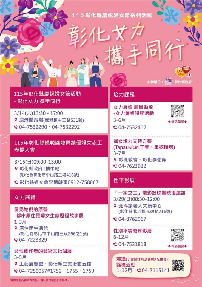 新聞焦點 公私協力彰化女力 攜手同行 Women38公益市集愛心義賣 發布日期 2026/03/14~2026/04/14 | 發佈單位: 社會處 | 發佈日期: 許代理科長 7532291 | 更新日期 2026/03/14 | 瀏覽人數: 28人 為響應國際婦女節到來,彰化縣政府14日在鹿港鎮立體育場舉辦「115年彰化縣慶祝婦女節活動-彰化女力 攜手同行」,縣長王惠美到場支持並與鄉親一同為活動揭開序幕。王縣長表示,為響應2026年國際婦女節主軸的「Give to Gain(付出即有收穫)」,活動現場除了設有「CEDAW女力決策互動區」及打卡牆外,還有「Women38公益市集」愛心義賣,義賣活動,自109年起至今,連續五年每年捐助百萬元,支持縣內社福機構籌建家園及興建設施,義賣善款累計已達新臺幣500萬餘元,今年義賣所得將捐助給「社團法人彰化縣小嶺頂愛啟兒關懷協會」作為建造「愛啟兒社區日間作業設施」之用,感謝鄉親把家中物品透過義賣,傳達互助互惠的精神,以實際行動支持公益,將愛轉化成改變的力量,造福更多弱勢朋友。 王縣長表示,女力是股溫暖且團結的力量,在家庭、職場及社會各個角落努力耕耘,是家庭與社會穩定的重要基石,這次活動公私協力,結合縣府各局處、相關婦女團體及社福團體等,感謝各婦女及社福團體長期對提升婦女福利與權益的支持與投入,讓彰化在推動婦女權益及性別平等的道路上持續向前行。 王縣長指出,依據每五年辦理一次的「113年彰化縣婦女生活狀況需求調查」顯示,本縣女性承擔家務的比例高於全國平均,且每日從事家務時間較男性長,顯示家務分工仍有努力的空間。今日活動特別設計4關以「家務分工」為主題的性別平等家務分工體驗競賽區,傳達家務承擔的理念,從家庭日常開始實踐性別平等。縣府也跨領域規劃辦理115年彰化縣模範婆媳與績優婦女志工表揚大會、「女力展翅 鳳凰助飛」女力創業課程活動、彰化女路走讀、女力展覽、性別平等教育影展、性別平等講座、婦癌篩檢、各類紓壓培力等系列活動,邀請各界踴躍報名參加,課程活動,以尊重、互愛與包容,打造性別友善的城市。 與會貴賓還有縣議員陳玉姬、施佩妤、凃淑媚、立法委員陳素月服務團隊、縣府社會處長王蘭心、副處長涂敏群、彰化縣婦女會理事長陳穎青、輔導理事長楊秀霞、田中鎮青溪婦女會理事長邱雅涵、溪湖婦聯會主委黃瑞珠、埔鹽青溪婦女協會理事長張美霞、彰化縣埔鹽婦女會理事長陳貴玲、彰化縣姐妹會理事長林碧鬆、彰化縣女性培力協會理事長陳翠蓮、彰化縣婦女發展協會理事長黃椿樣、彰化縣東南亞文化協會理事長邱莉亞、彰化縣二水鄉婦女會理事長陳昭麟、彰化縣婦女企業諮詢委員會副會長巫美玲、越南橋裔高階人才在台總會理事長范氏伶、各級民代、地方仕紳等。