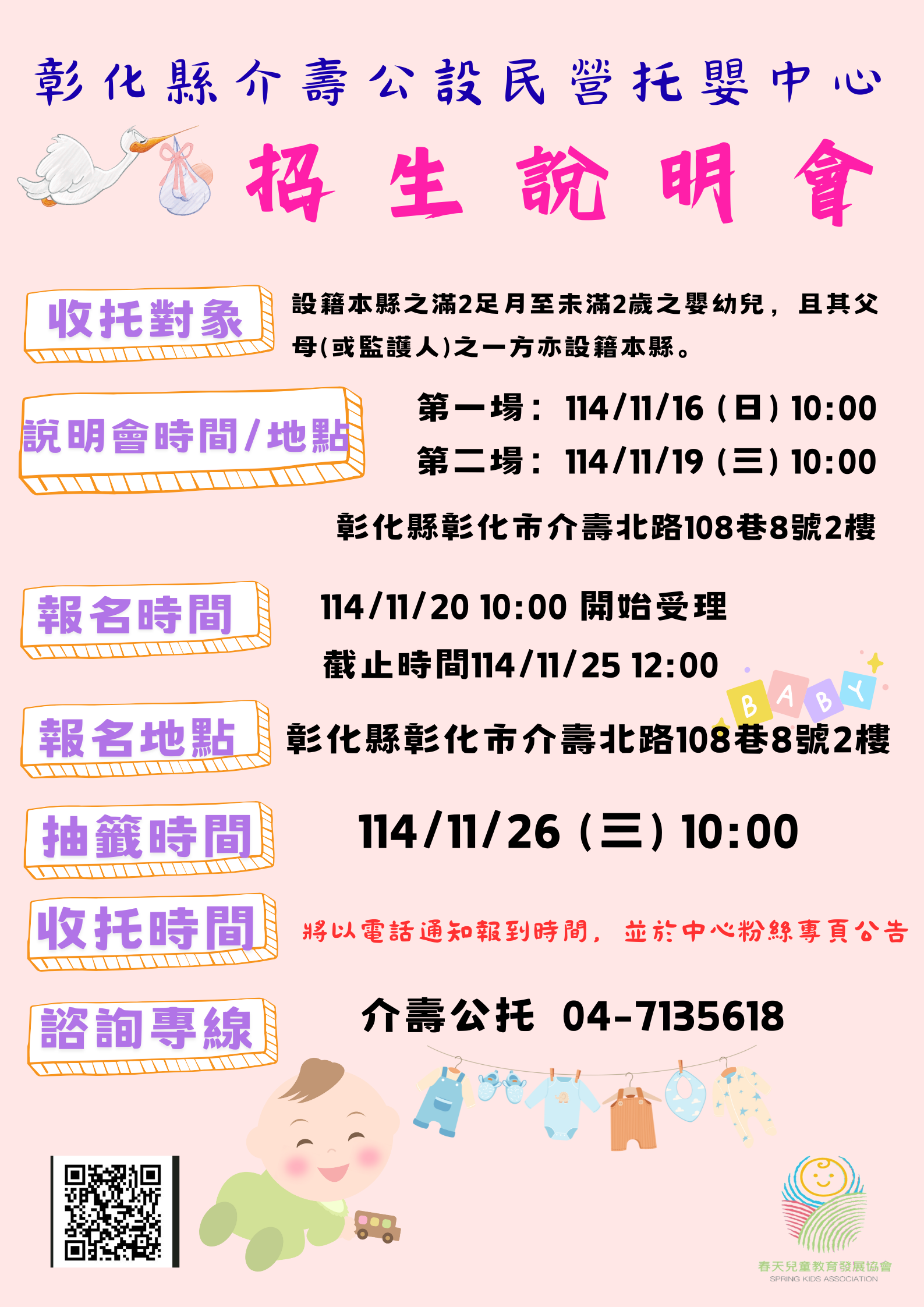 公告資訊 114/11/20-114/11/25彰化縣介壽公設民營托嬰中心報名開始囉! 發布日期 2025/11/13~2025/12/13 | 發佈單位: 社會處兒童及少年福利科 | 發佈日期: 劉佳宜 7532268 | 更新日期 2025/11/13 | 瀏覽人數: 43人 12月8日「介壽公設民營托嬰中心」即將正式揭開序幕囉! !! ☆☆地點就在彰化縣彰化市介壽北路108巷8號2樓☆☆ 公設民營托嬰中心收托60名0~2歲幼兒,提供平價優質的托育環境,讓家長安心就業,減輕家長托育負擔 ~ ☆☆2場招生說明會將正式開跑~~~ ★歡迎爸爸媽媽報名參加,以下為說明會相關資訊: ★彰化縣介壽公設民營托嬰中心招生說明會 ★ ★ 收托對象: 1、嬰幼兒及其父母設籍彰化縣 2、滿二足月且未滿二歲之嬰幼兒 ★ 說明會場次: 第一場:114年11月16日(星期日)10時00分 第二場:114年11月19日(星期三)10時00分 ★ 說明會地點:彰化縣介壽公設民營托嬰中心 (彰化縣彰化市介壽北路108巷8號2樓) ★ 說明會報名專線: 04-713-5618 ★有任何報名相關問題請來電諮詢 介壽公托:04-713-5618 吳主任 社會處:04-7532268劉小姐