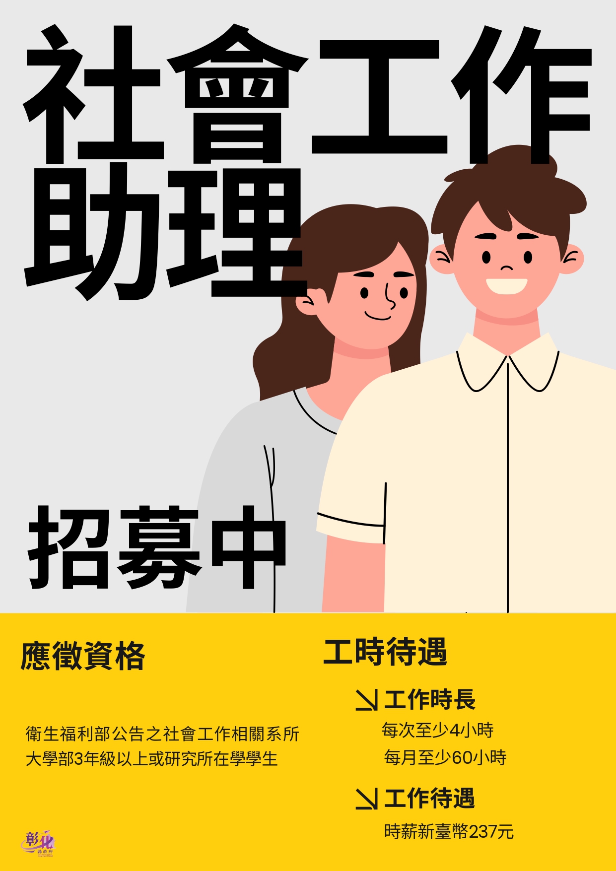 公告資訊 徵才-彰化縣政府社會福利服務中心社工助理 發布日期 2026/03/11~2026/03/31 | 發佈單位: 社會處婦女及新住民福利科 | 發佈日期: 許元豪社工督導 04-8889995分機10 | 更新日期 2026/03/11 | 瀏覽人數: 341人 ※資格條件: 依衛福部規定僅供社會工作相關學系大學部3年級以上或研究所在學學生應徵)【非現社工相關系所在學生請勿投遞】 1.工作期間最長2年(含寒暑假),每次上班至少4小時,每月至少60小時,並依各單位業務屬性調整工作時間,時薪新臺幣237元(依衛福部規定辦理),工時上限、休假、勞健保等勞動條件,按「勞動基準法」及「僱用部分時間工作勞工應行注意事項」等勞動相關法規辦理。 2、另視甄試成績增列備取人員至多1名,列冊候用期間2個月(自甄選結果確定之翌日起算)。甄選結果將公告於社會處網頁,惟應徵人員均不適當,本中心得予從缺。 ※報名方式: 1.意者請於115年3月31日下午5時前填具【(姓名)社工助理員報名表】及【在學證明或學生證影本】(學生證應蓋有學期冊章,若無註冊章應提供在學證明影本)、【歷年成績單】一式4份,並請將掃描電子檔寄至聯絡人電子郵件信箱:asdfhsu@email.chcg.gov.tw。信件主旨請敘明「應徵社安網社工助理職缺」並掛號郵寄或親送至北斗區社會福利服務中心許元豪先生(地址:彰化縣北斗鎮復興路270號6樓),信封註明「應徵社安網社工助理職缺」字樣(郵寄請一律以「掛號」寄送,如以平信郵遞,致發生遺失或遲誤,責任自負)。 註:證件如有偽造或變造,於錄取後,查明屬實者,取銷錄取資格