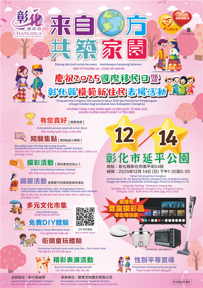 年度活動 彰化縣政府慶祝2025國際移民日暨彰化縣模範新住民表揚活動 發布日期 2025/11/10~2025/12/14 | 發佈單位: 社會處婦女及新住民福利科 | 發佈日期: 高翊騰 753-2288分機2288 | 更新日期 2025/11/10 | 瀏覽人數: 38人 彰化縣政府慶祝2025國際移民日暨彰化縣模範新住民表揚活動 12/14(日)13:30至17:00在彰化市延平公園熱鬧盛開! 一年一度讓彰化縣新同胞及千里迢迢來臺工作者回娘家的節日來囉!一起來品嚐家鄉味、感受家的擁抱、也給今年得獎的兄弟姐妹一個熱烈的掌聲! ♥國服活動:來往的人群穿著懷念的家鄉服飾,帶你一秒穿越到家鄉。趕快穿上珍貴的國服一起來玩吧,著國服者還可在現場領取「國服禮」唷! ♥多元文化市集:來自家鄉原汁原味的食材,回味那年魂牽夢縈的家鄉味!除此之外還有彰化縣娘家特有的38公益市集邀請您一起送愛心! ♥舞蹈表演:各國精彩表演齊聚一堂,從午High到晚! ♥闖關集點:各種遊戲挑戰,不怕你不玩、只怕玩不完!並有「闖關禮」等你拿! ♥免費異國DIY:特聘國外老師飛來臺灣教學,親手製作美麗飾品,大手筆、零負擔,機會難得。 ♥街頭童玩體驗:一秒帶你穿越回到家鄉的童年時光。 ♥摸彩活動:各種好禮讓你無償帶回家,哪裡有那麼好康的事?不用懷疑就在這裡! ♥性平及政令宣導:想不到吧!性平及政令宣導也是賣點?沒錯,我們的一站式服務讓您一次了解彰化縣娘家各項不可不知的重要政策,讓我們一齊守護您的權益。 邀請各位大手拉小手、樓上揪樓下,一起來Happy吧!