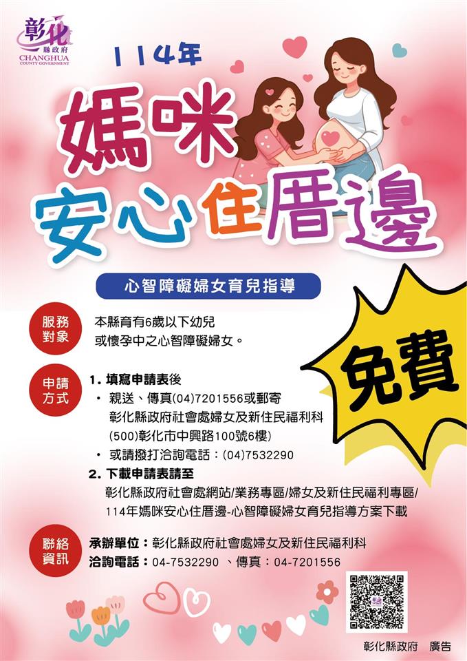 114年媽咪安心住厝邊-心智障礙婦女育兒指導方案 瀏覽人數: 503人 一、 計畫目的:(一)增進心智障礙婦女育兒期間之資訊可近性。(二)提升心智障礙婦女對新生兒照護與母嬰互動技巧。(三)強化心智障礙婦女基本育兒知能與家庭溝通協調能力。二、服務項目:親職示範、餐點預備、家務指導、親職諮詢等三、服務對象:(一) 設籍且實際居住本縣、15歲至55歲之心智障礙懷孕婦女。(二) 設籍且實際居住本縣、家有6歲以下幼兒之心智障礙婦女。四、費用:免費五、申請方式:(一)檢附文件:1.申請表 2.幼兒及申請人之身分證明文件影本(戶口名簿、身分證、媽媽手冊…等)(二)申請方式:親送、傳真(04)7201556或郵寄彰化縣政府社會處婦女及新住民福利科(500彰化市中興路100號6樓)六、聯絡資訊承辦單位:婦女及新住民福利科電話:04-7532290 梁社工師 傳真:04-7201556