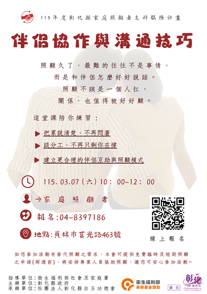 115年3月彰化縣家庭照顧者支持服務-白玉據點 💬 伴侶協作與溝通技巧 瀏覽人數: 23人 照顧久了,最難的往往不是事情,而是和伴侶怎麼好好說話。這堂課陪你練習:✔ 把累說清楚,不再悶著✔ 談分工,不再只剩你在撐✔ 建立更合理的伴侶互助與照顧模式照顧不該是一個人扛,關係,也值得被好好顧。📅 時間|115年03月07日(六)10:00–12:00📍 地點|員林市莒光路463號👨👩👧 對象|家庭照顧者💰 費用|免費參加(額滿為止)☎ 報名|04-8397186 林社工🔗 線上報名|https://forms.gle/x2G4KpnmE5wMsucT8🔔 報名成功後,會由承辦人員致電確認✅指導單位:衛生福利部社會及家庭署主辦單位:彰化縣政府承辦單位:社團法人彰化縣白玉功德會