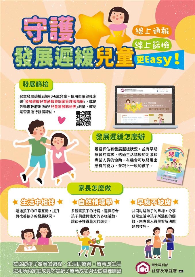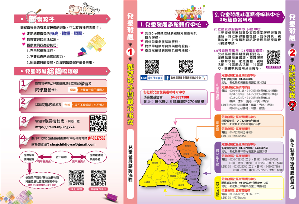 6-1-1【兒童發展起步走~手冊指引】彰化縣早期療育服務家長資源手冊 瀏覽人數: 6066人 兒童發展需要您我用心觀察~早期發現 早期介入 0至6歲是兒童發展黃金期,3歲前療育效果將提高10倍,發展遲緩兒童若能在此階段得到完善的照顧與治療,有很大的機會可以恢復。因此彰化縣政府致力推動早期療育,重視兒童發展及家庭支持,運用彰化縣公益彩券盈餘分配基金推動早期療育服務,成立一處「兒童發展通報轉介中心」,關心0至6歲有發展疑慮或發展遲緩之兒童,受理通報個案、兒童發展諮詢及資源轉介等,並成立四處「兒童發展社區資源服務中心」(彰化區、和美鹿港區、員林田中區、二林北斗區),提供兒童、家庭支持及資源連結等服務,讓有需求的兒童及家庭在黃金時期得到妥適的多元化服務。為使發展遲緩兒童能穩定接受療育服務,縣府提供「發展遲緩兒童早期療育費用補助」,包含療育訓練費、交通費、到宅療育費,自113年1月1日起非低收入戶兒童補助最高每月4,000元、低收入戶兒童每月最高補助6,000元,符合資格民眾按季於4月5日前、7月5日前、10月5日前、12月5日前(遇假日則順延)向兒童發展通報轉介中心或兒童發展社區資源服務中心提出申請。為保障兒童發展權益,考量資源有效運用及彈性,促進發展遲緩兒童及早接受療育,掌握其最佳療育黃金期,彰化縣政府自113年10月8日起函頒修正「彰化縣政府發展遲緩兒童早期療育費用補助實施要點」,刪除原療育費用及到宅療育費用單次金額限制500元,改以實際療育金額予以補助,鼓勵家長把握兒童最佳療效期並減輕家長經濟負擔。兒童發展需要您我用心觀察,0至6歲(未滿7歲)是兒童發展重要階段,尤其3歲前是關鍵「黃金療育期」。為提供完善的兒童發展篩檢服務,衛生福利部自113年7月1日起,針對未滿7歲的兒童,新增6次「兒童發展篩檢服務」,使用標準化工具進行『粗大動作』、『精細動作』、『語言認知』和『社會發展』等四大面向篩檢,以及早發現疑似發展遲緩兒童,提供衛教、追蹤或轉介。想瞭解更多兒童發展或早療資訊,可洽詢彰化縣兒童發展通報轉介中心(電話:04-8837588,地址:彰化縣北斗鎮復興路270號5樓),或彰化縣政府社會處兒童及少年福利科(電話:04-7263650),彰化縣政府與您一同關心兒童健康與發展,讓我們一起共創美好彰化、希望城市。